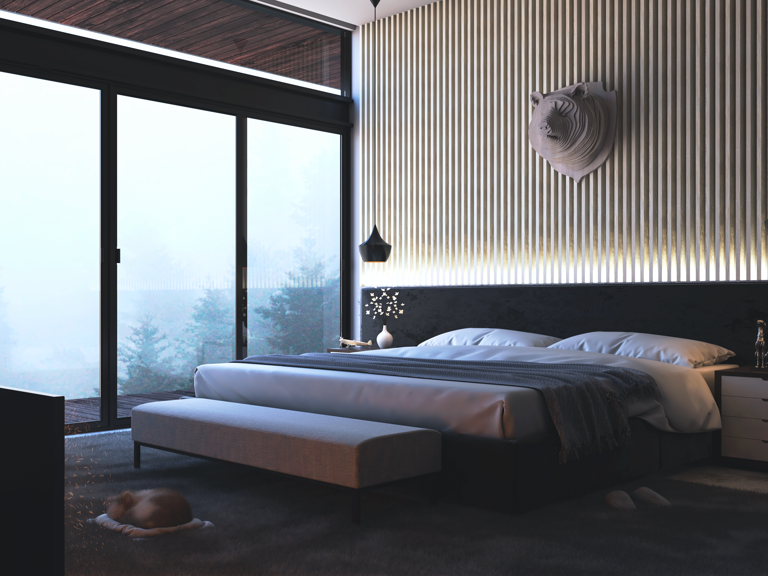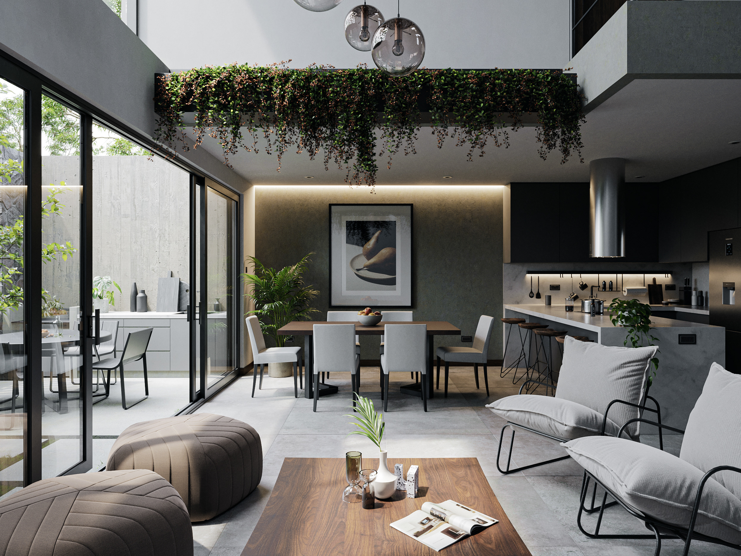 Contemporary residence featuring stunning panoramic views and a double-height space that enhances spatial experience and fosters emotional connection for its inhabitants.