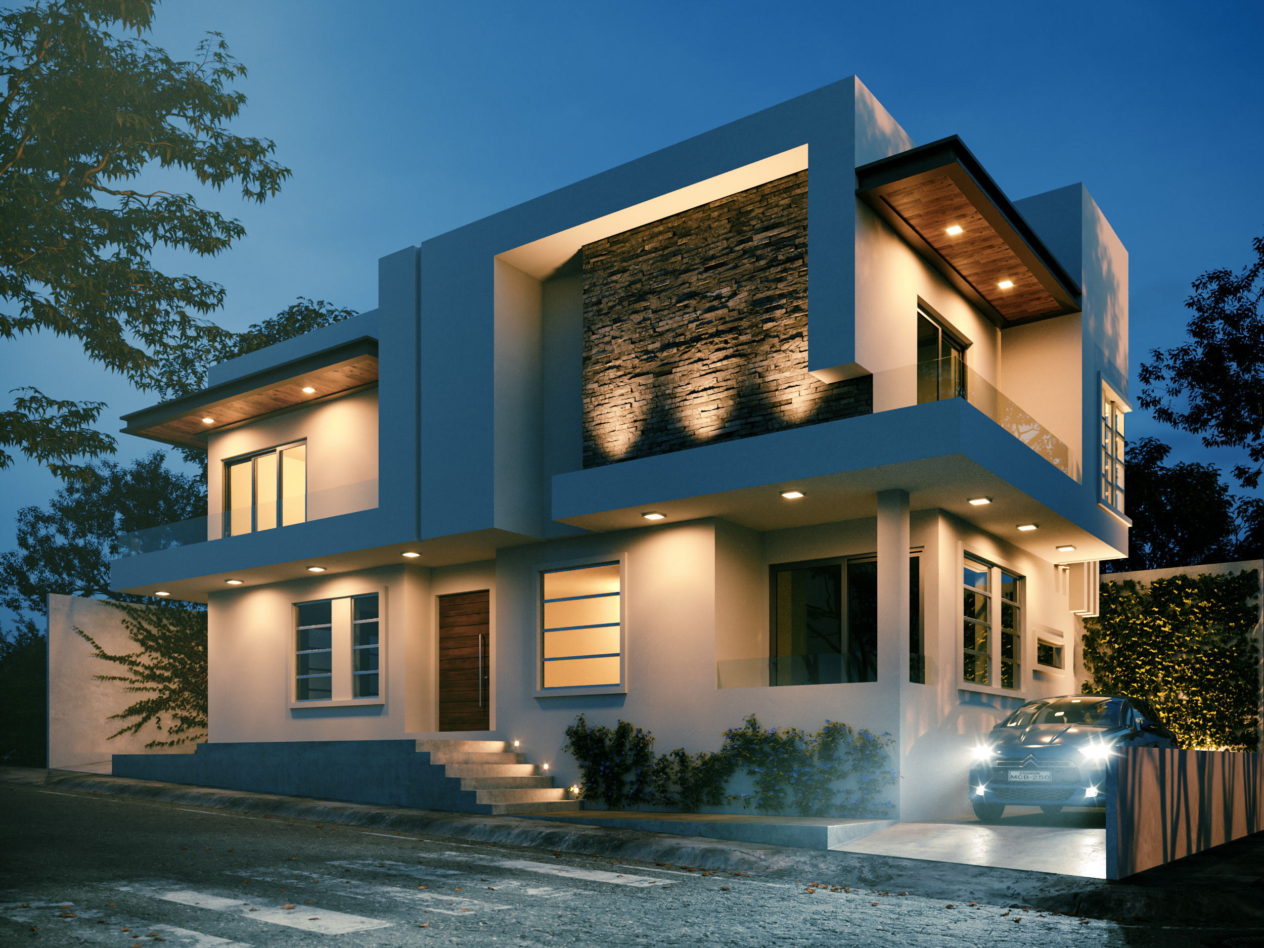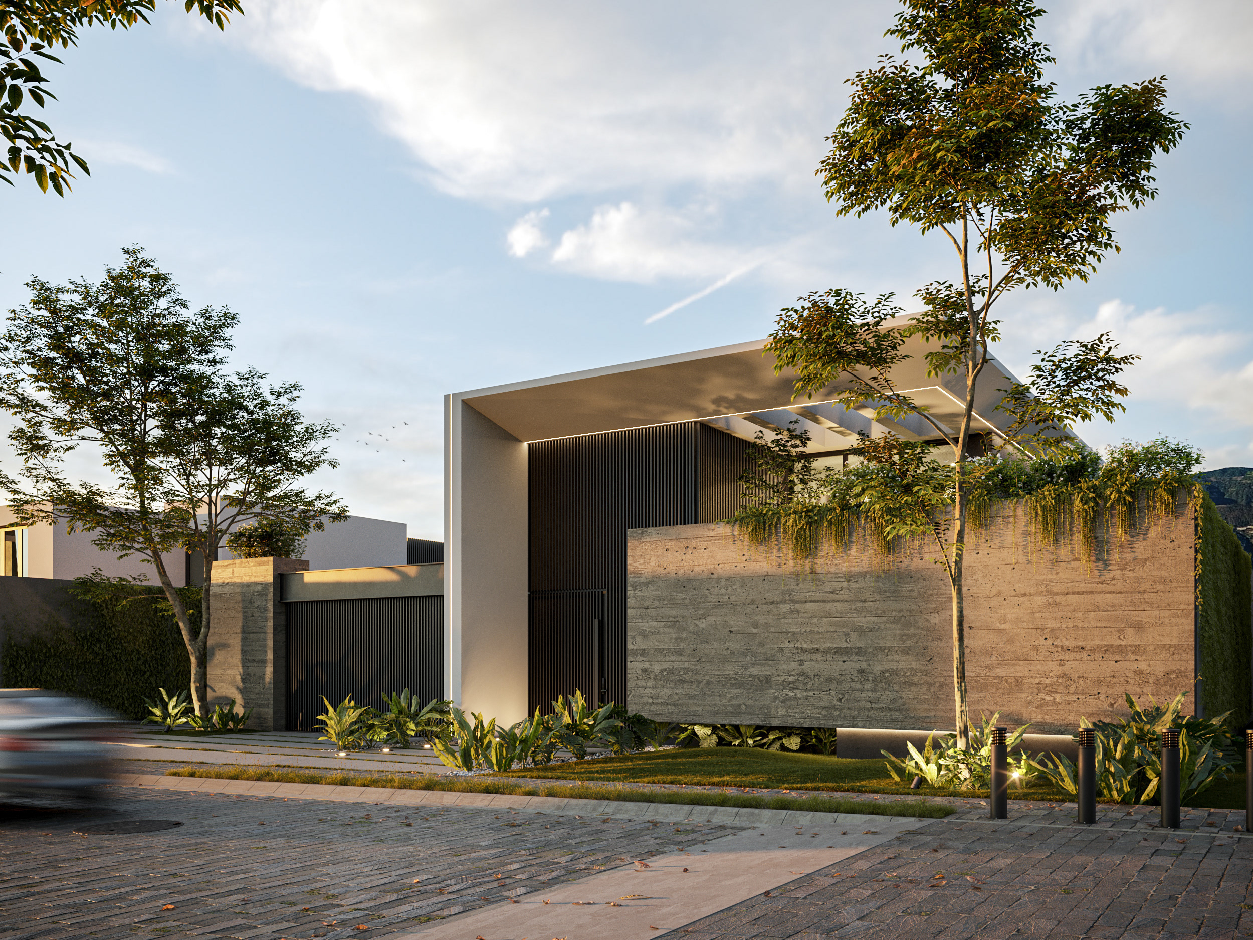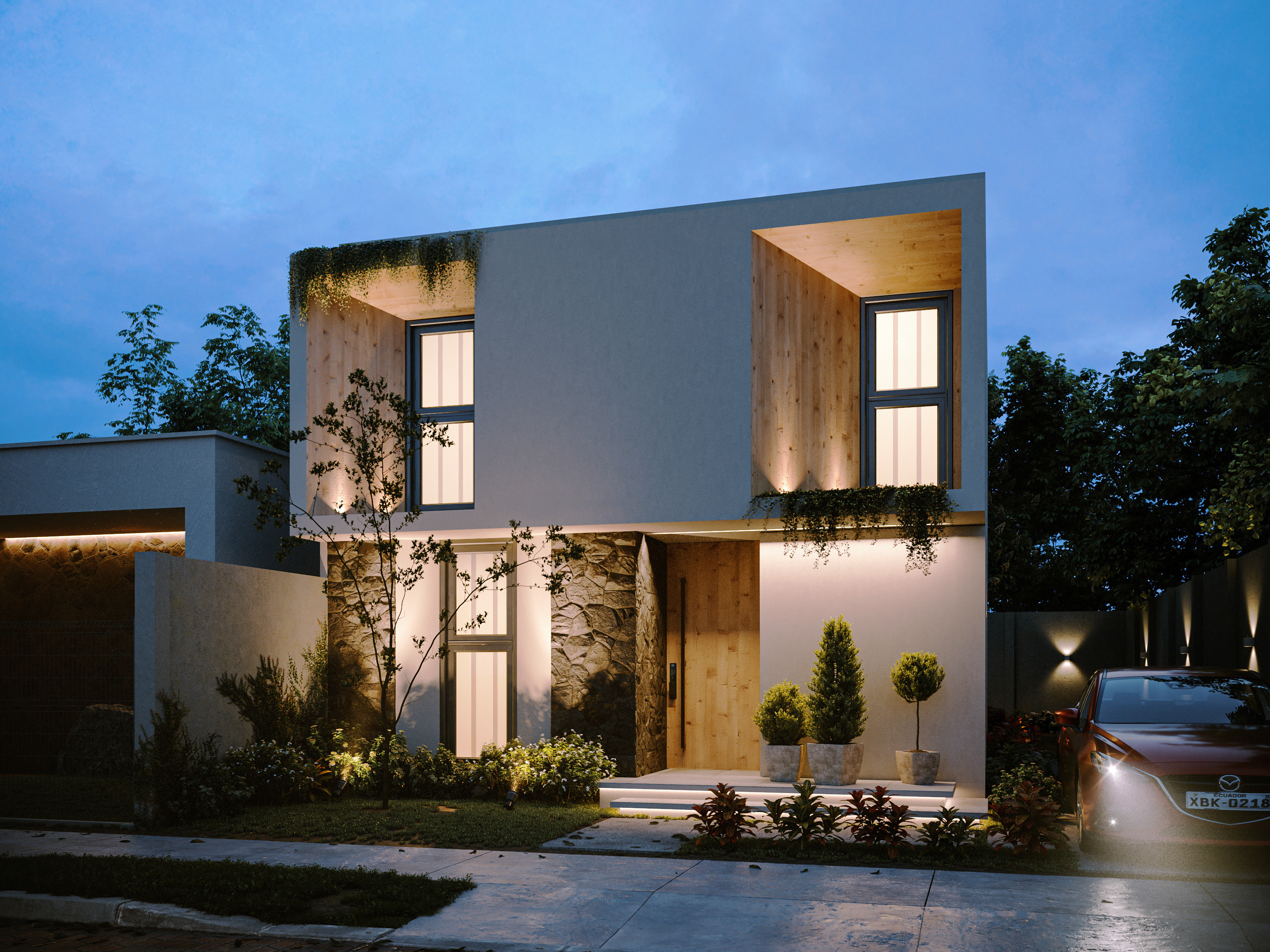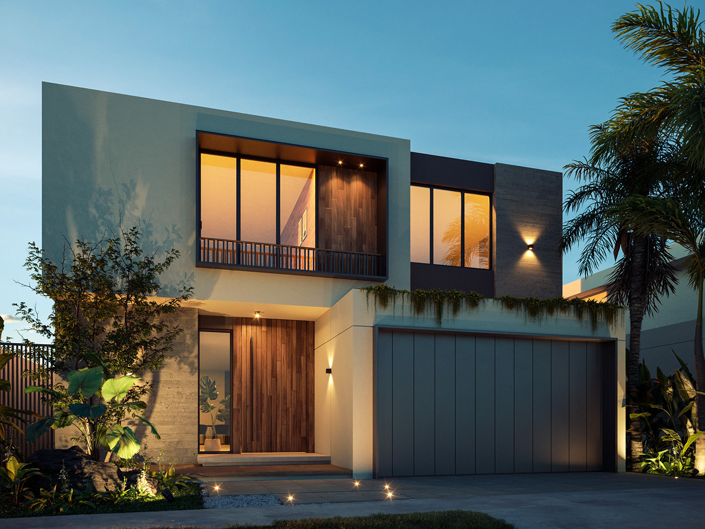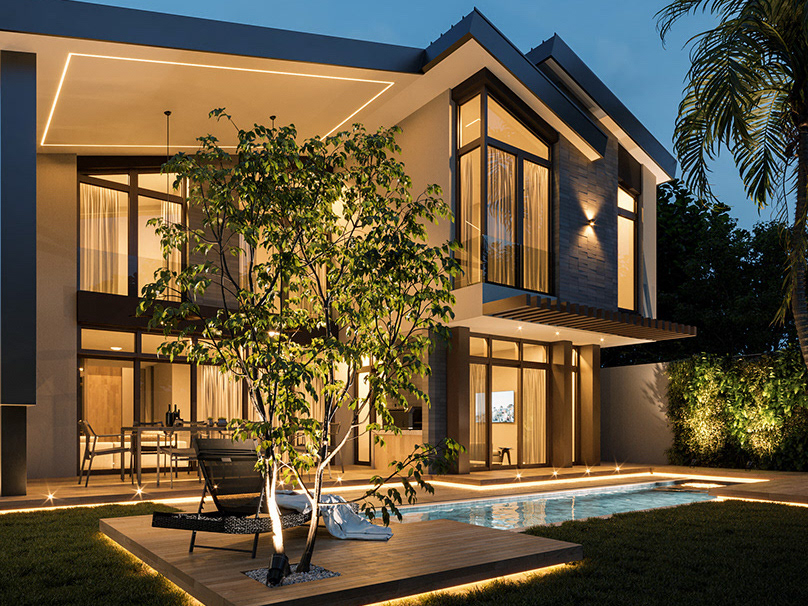An exterior design with tropical architecture where nature and lights are the main protagonist. Sobriety predominates through materials that denote its warmth