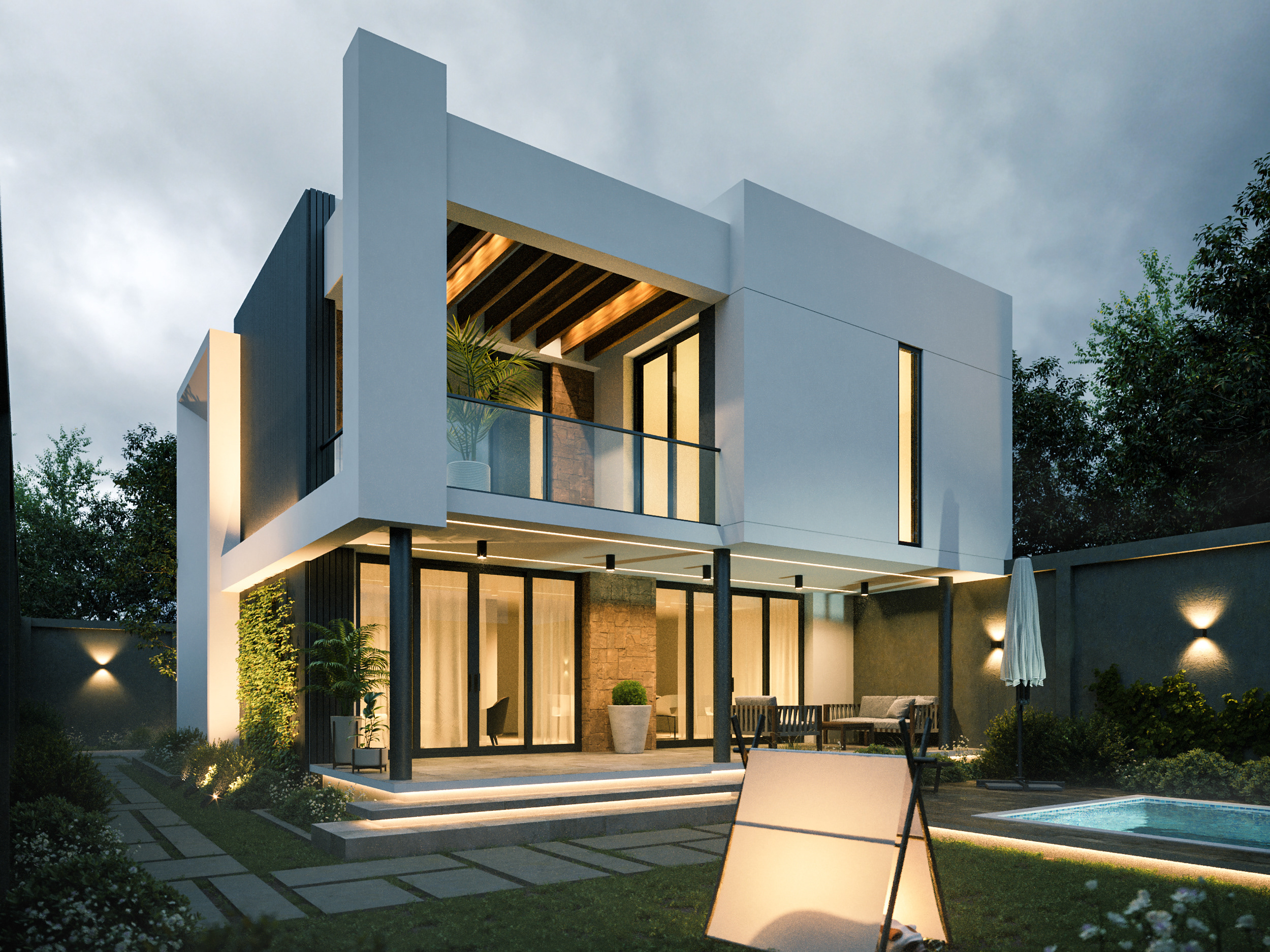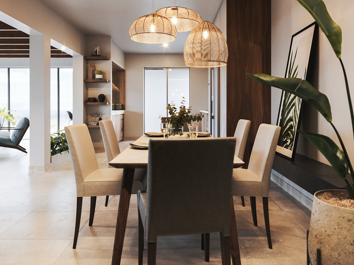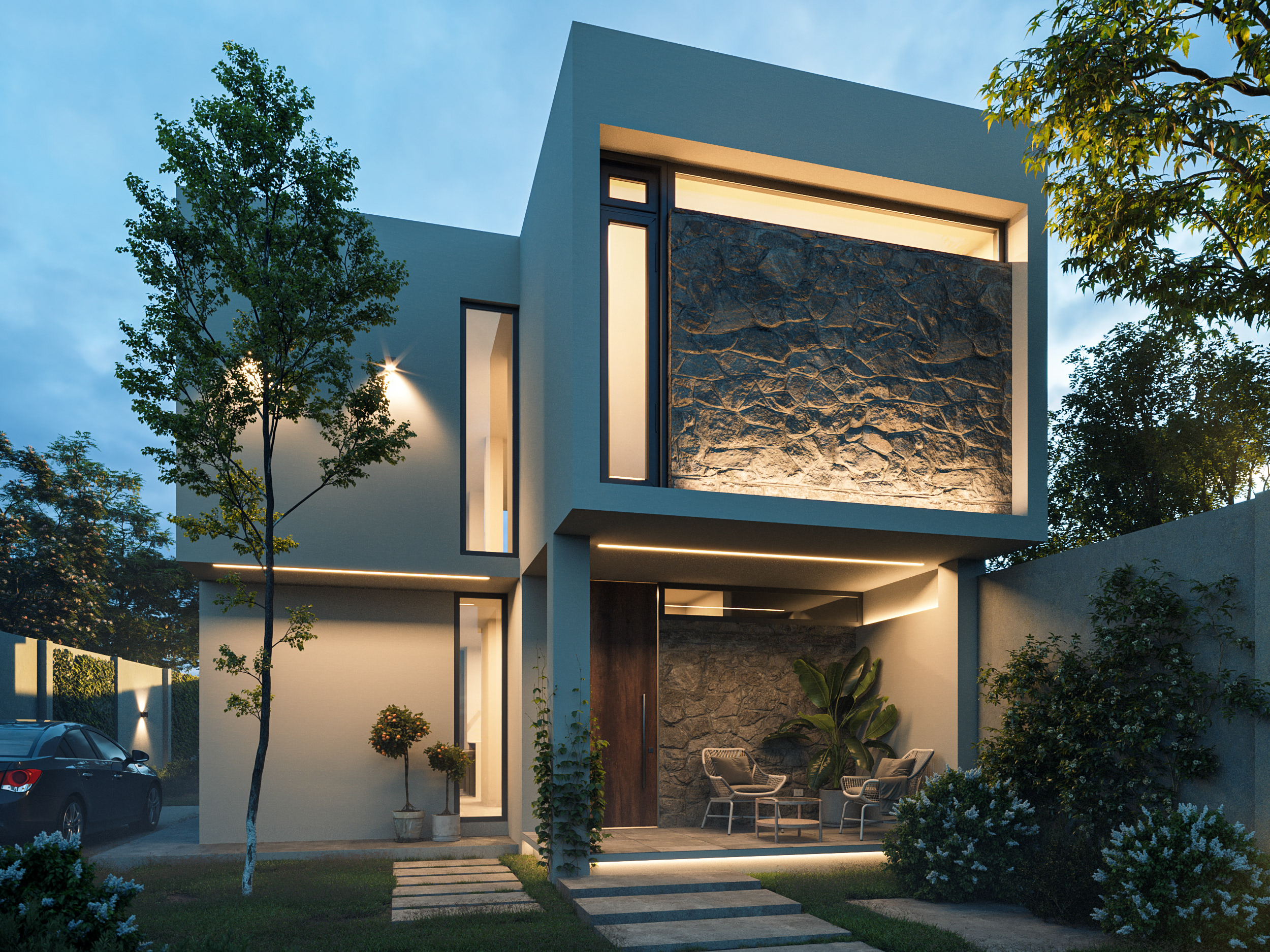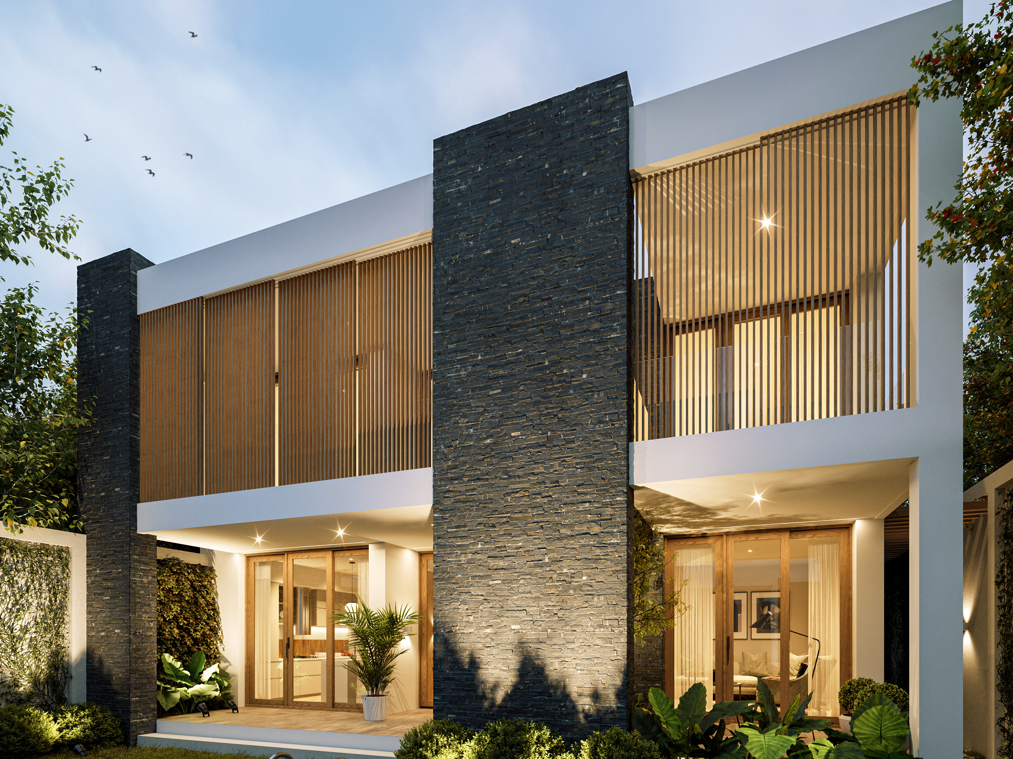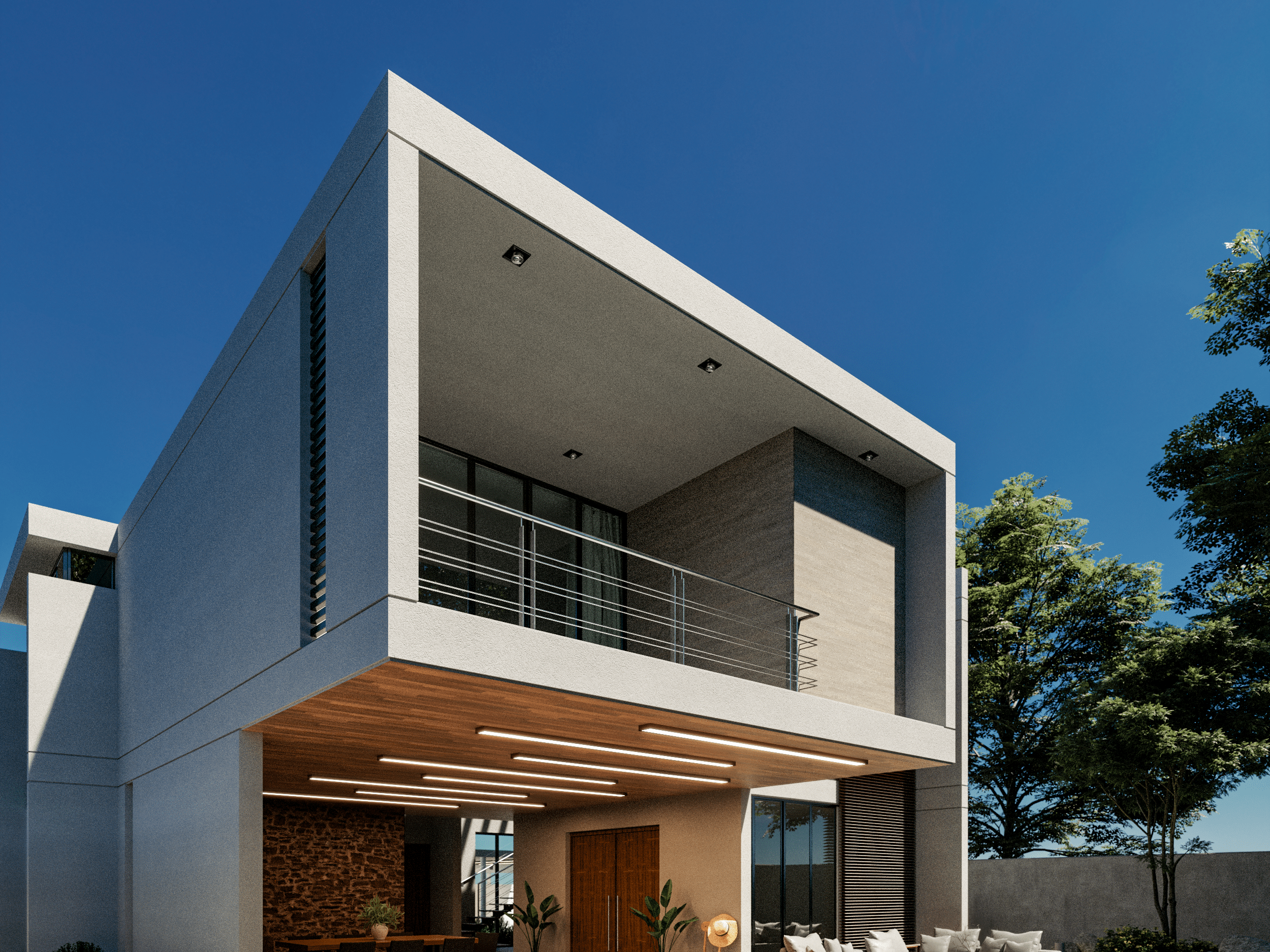 An exterior design with tropical architecture where nature and lights are the main protagonist. Sobriety predominates through materials that denote its warmth